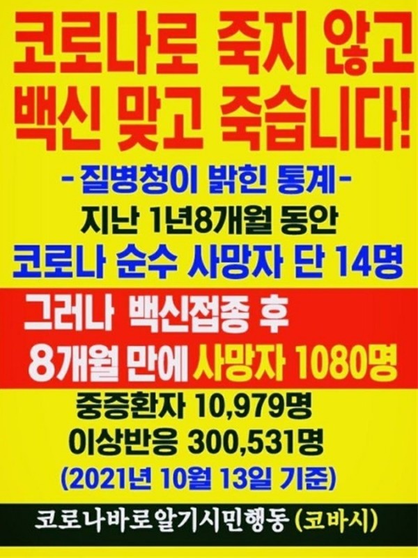 코로나로 죽지않고 백신 맞고 죽습니다.