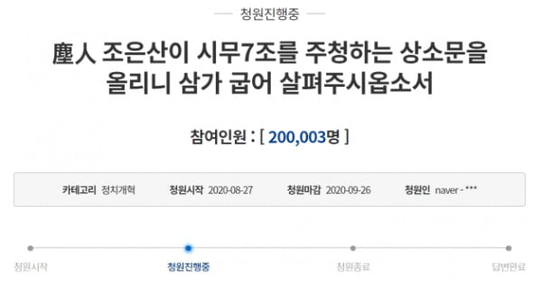 청와대 국민청원 게시판에 올라왔으나 비공개 처리돼 논란을 빚었던 이른바 '시무7조 상소문'이 지난 27일 오후 공개로 전환된 지 하루 만인 28일 동의 20만명을 돌파했다.