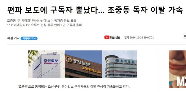 이런 가운데 스카이데일리가 런칭한 유튜브 채널은 하루 만에 구독자가 1만 명을 돌파하면서 보수 언론의 지형이 빠르게 재편되는 듯한 양상이다.