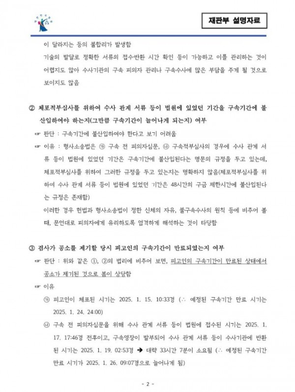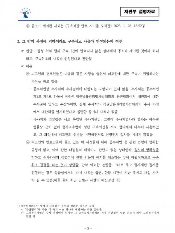 지귀연 판사의 윤석열 대통령에 대한 재판부 설명자료 (구속취소 결정 설명문)