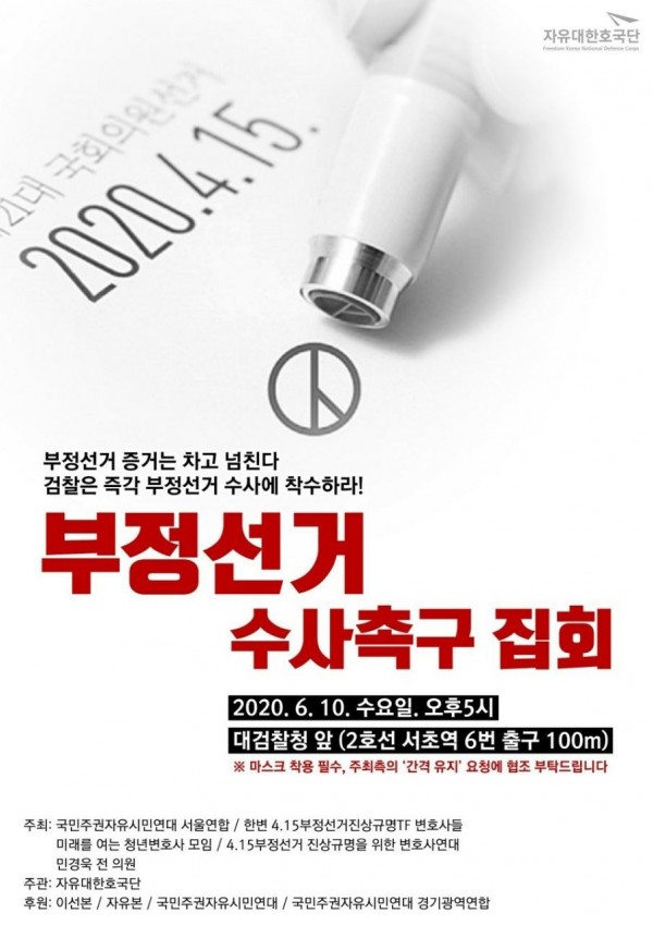 오늘(6월 10일) 오후 5시에 대검찰청 앞, 서초역 6번출구 근처에서 4.15 부정 선거에 대한 검찰의 수사를 촉구하는 집회…